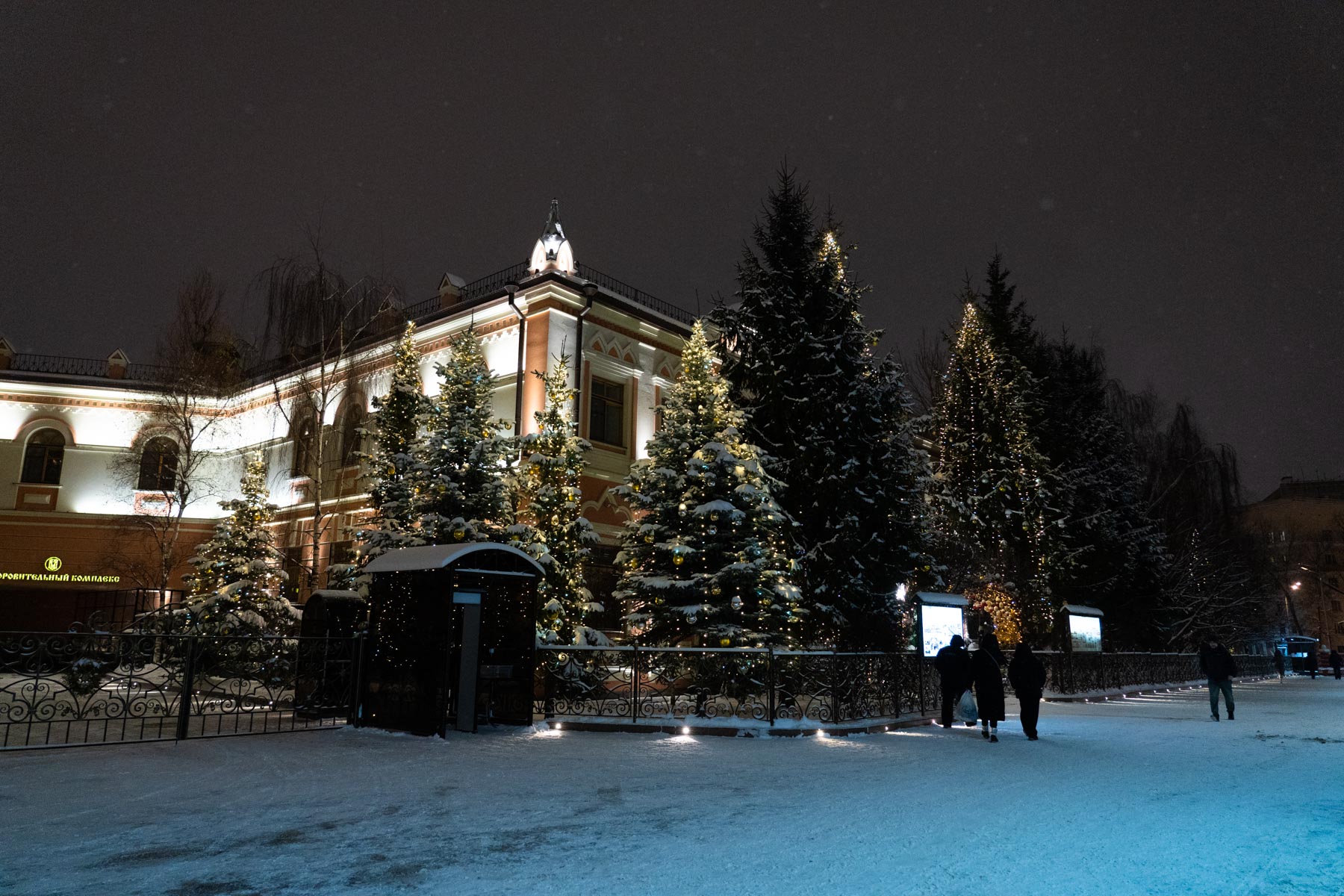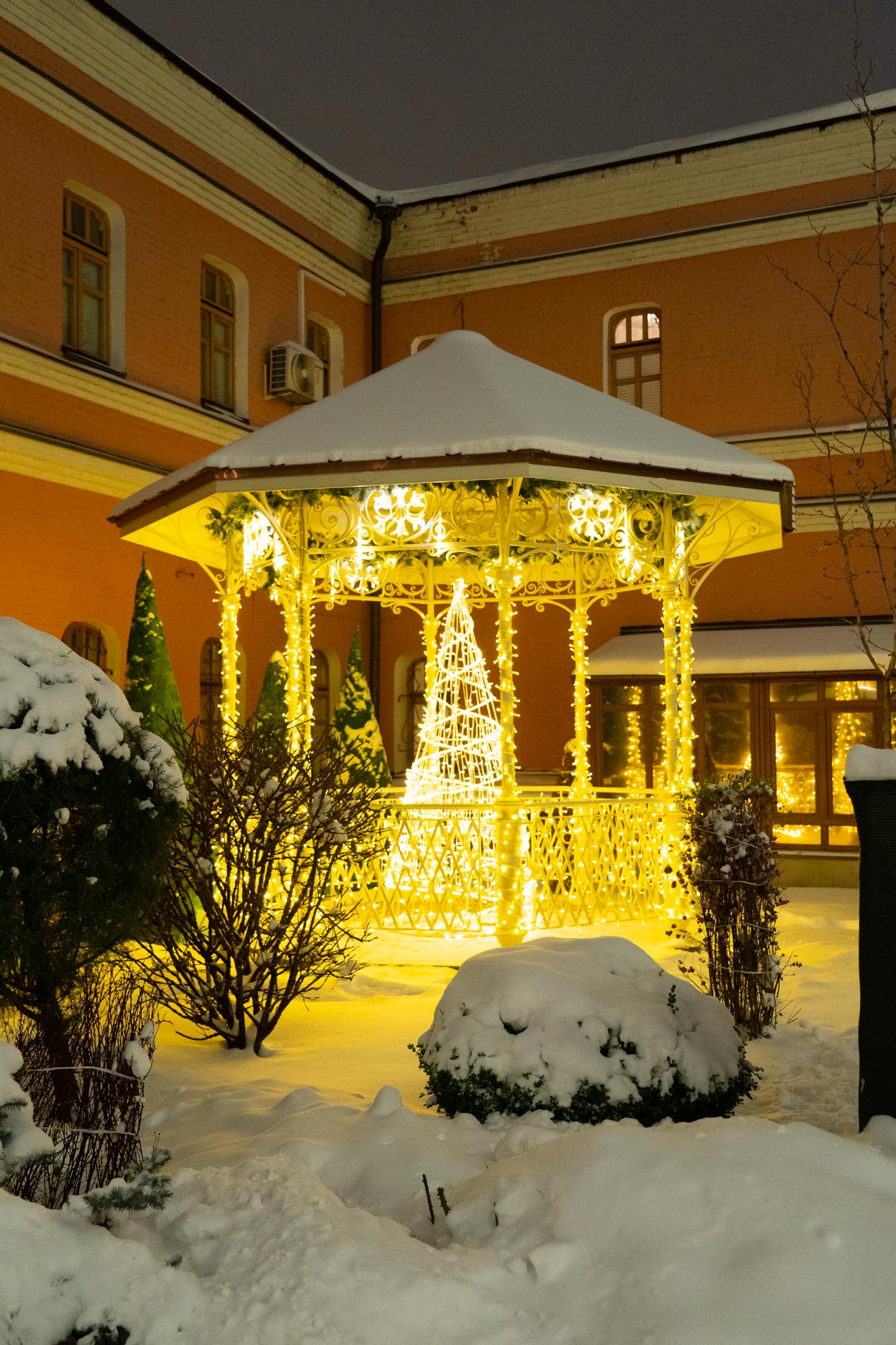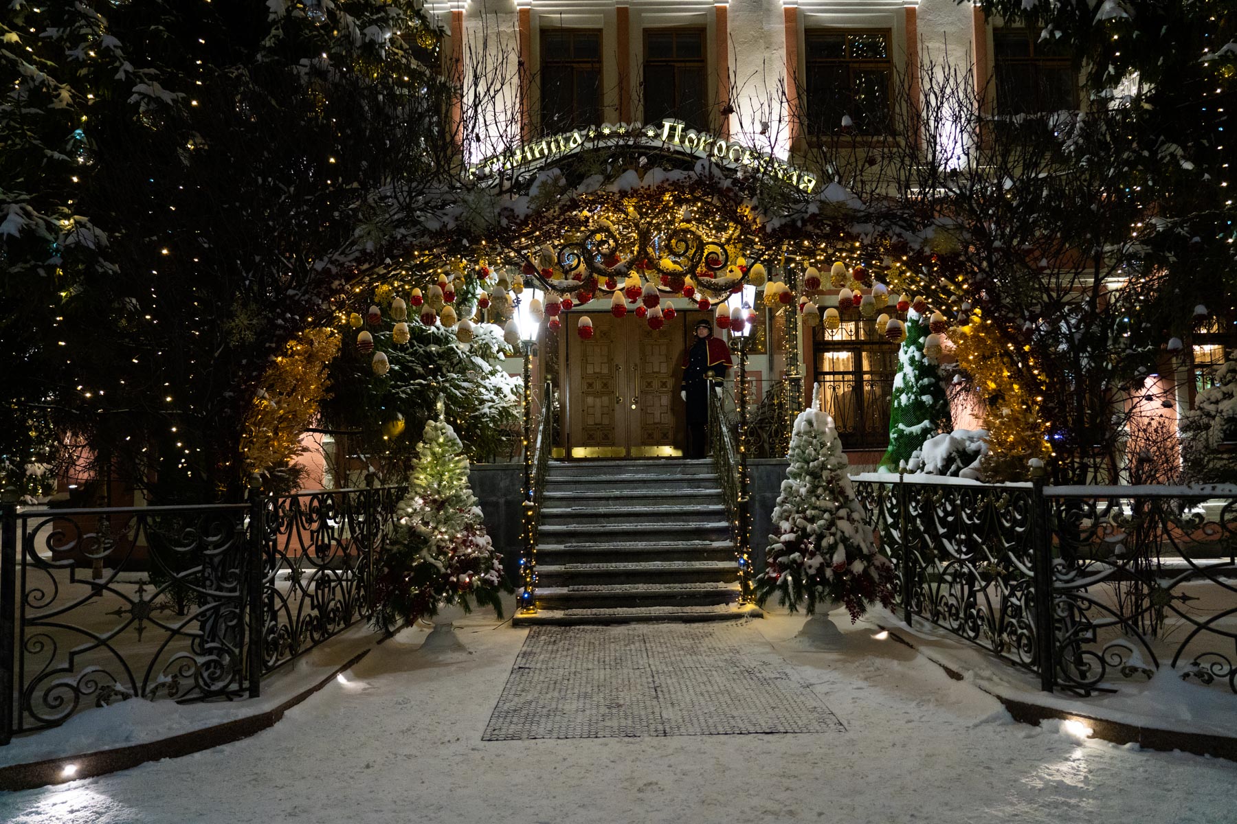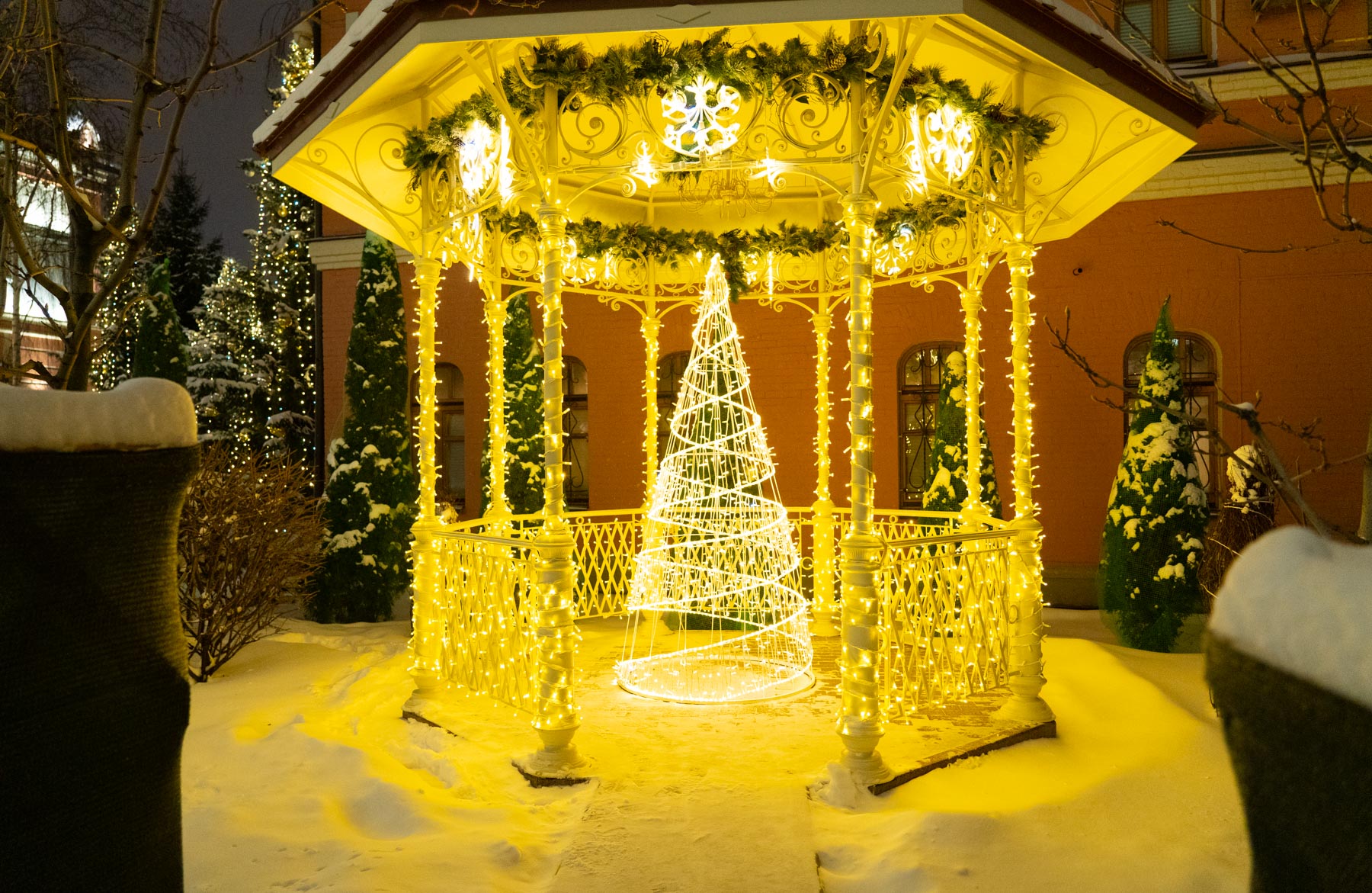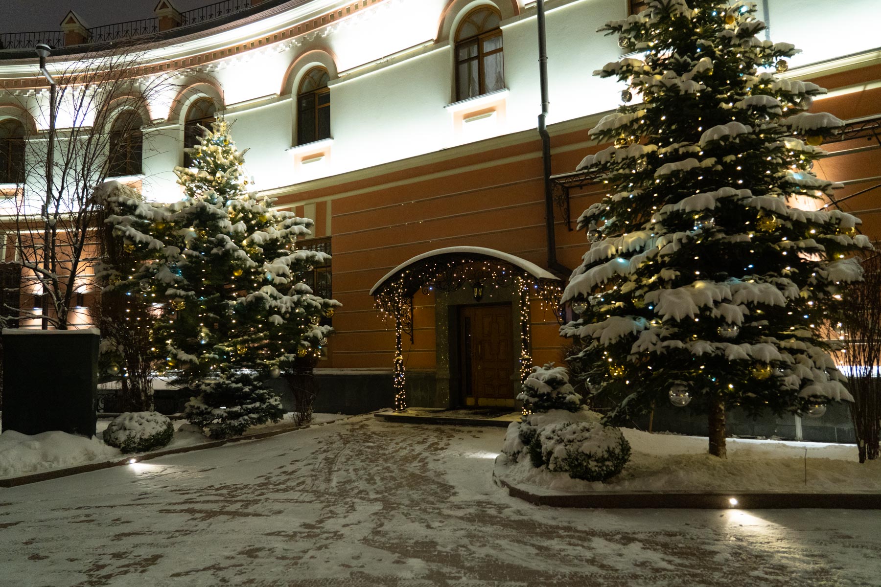 Следуя этой традиции, мы создаём не просто декор, а цельный художественный образ. В этом году мы подошли к процессу как к созданию большой иллюстрации: продумали композицию, где главным «акцентом» стала сияющая арка при входе, «сюжетными линиями» — мерцающие контуры дорожек, а «заливкой фона» — мягкая подсветка деревьев. Даже привычные снежные сугробы, отражающие огни, стали частью этой живой картины.
