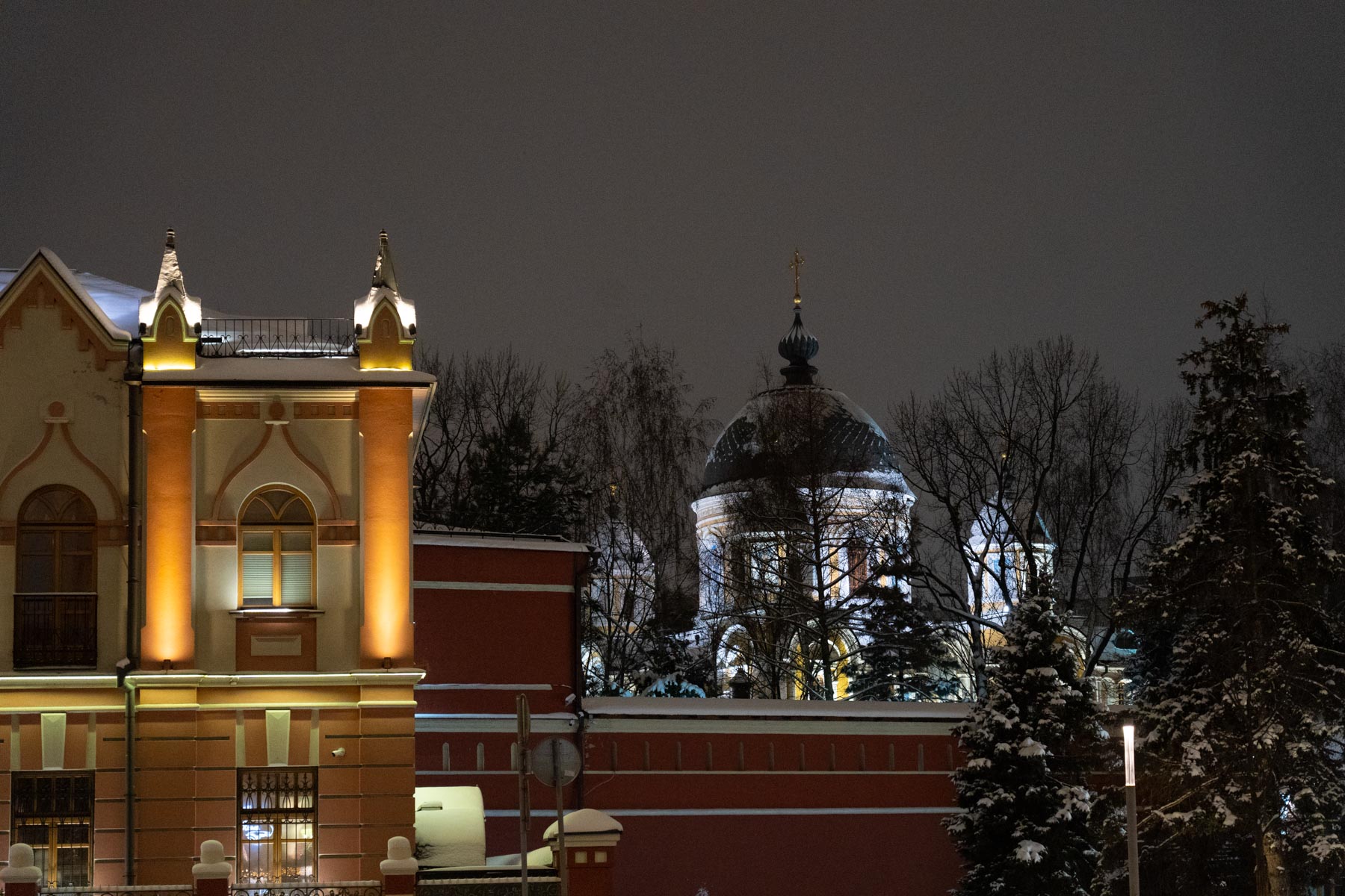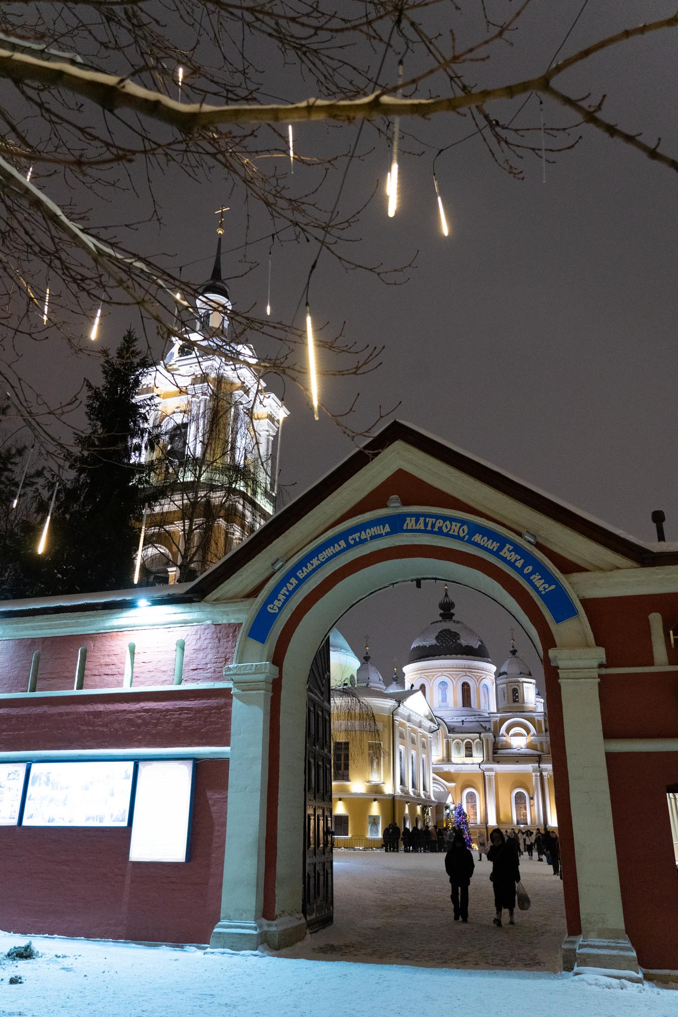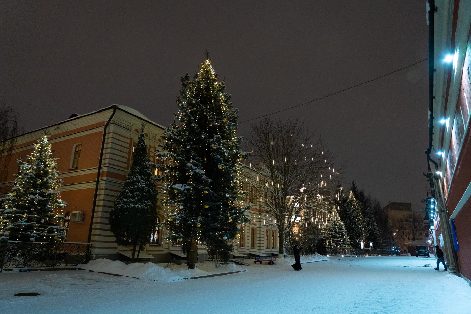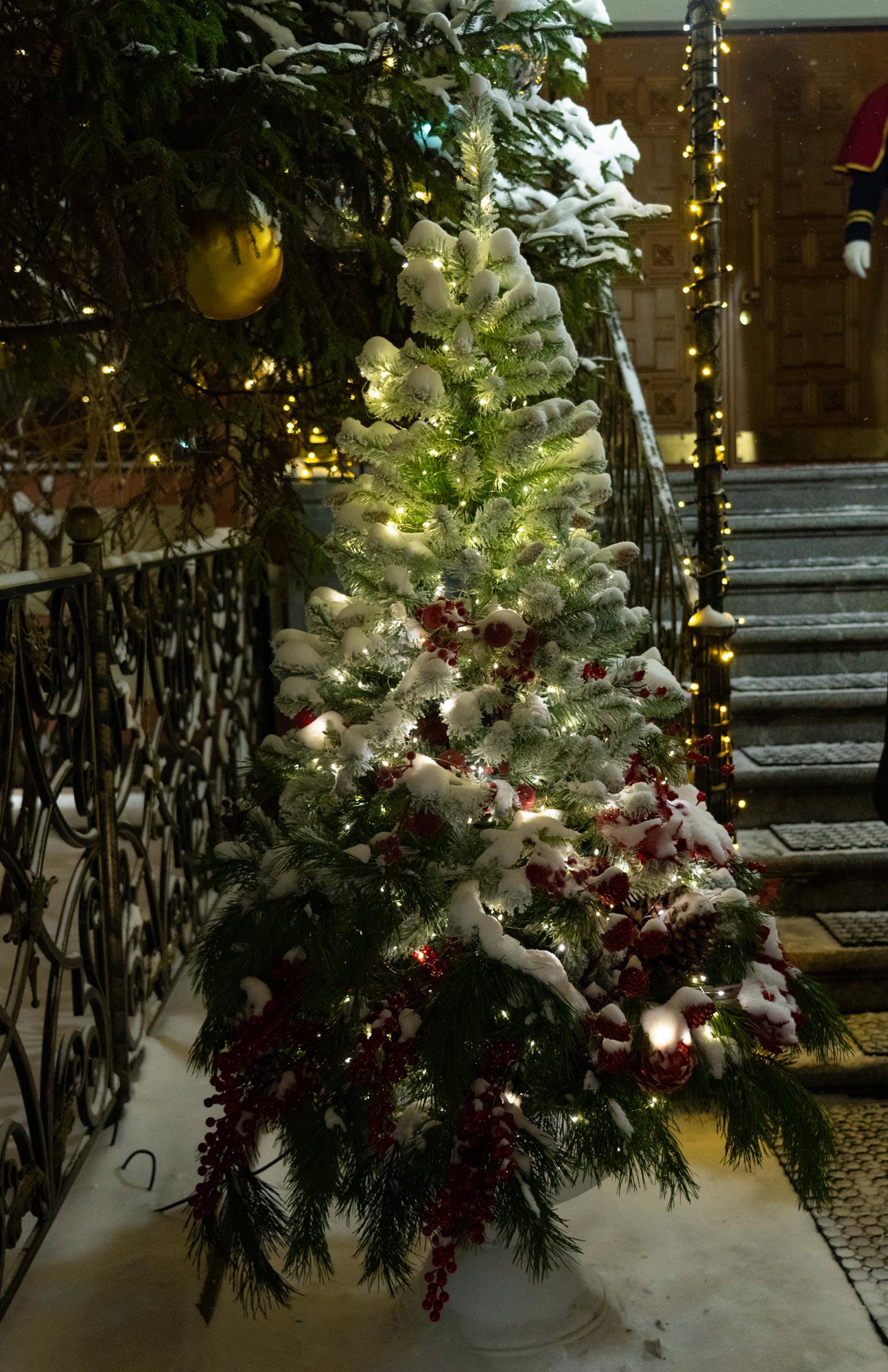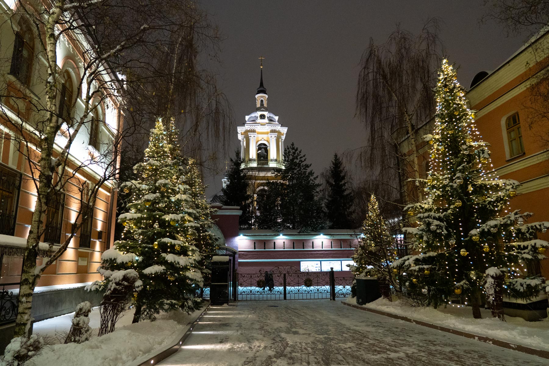Следуя этой традиции, мы создаём не просто декор, а цельный художественный образ. В этом году мы подошли к процессу как к созданию большой иллюстрации: продумали композицию, где главным «акцентом» стала сияющая арка при входе, «сюжетными линиями» — мерцающие контуры дорожек, а «заливкой фона» — мягкая подсветка деревьев. Даже привычные снежные сугробы, отражающие огни, стали частью этой живой картины.